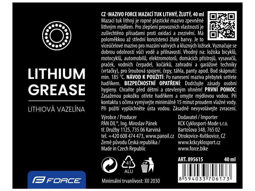 mazací tuk FORCE lithiový, žlutý, je ropné plastické mazivo zpevněné lithiovým mýdlem